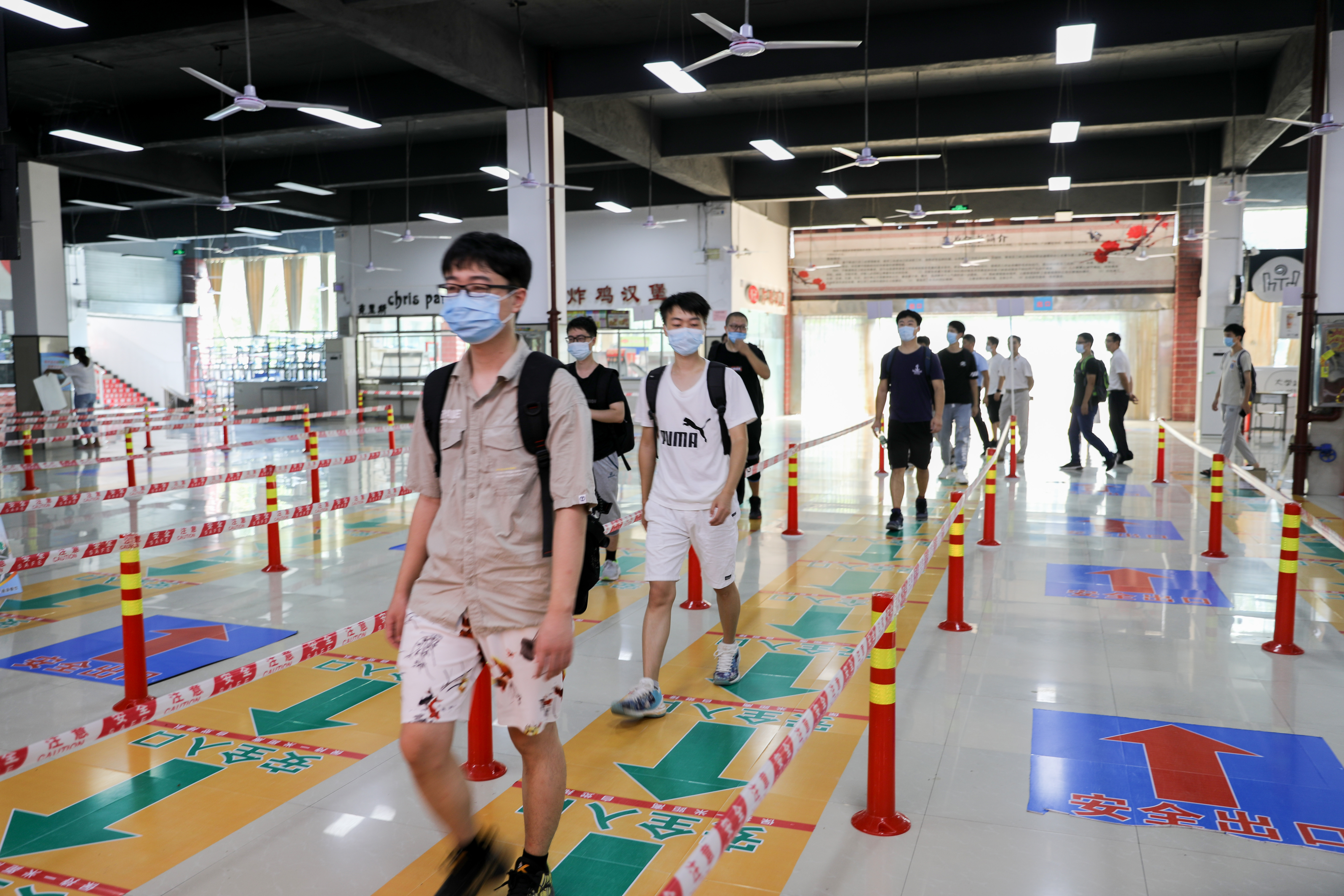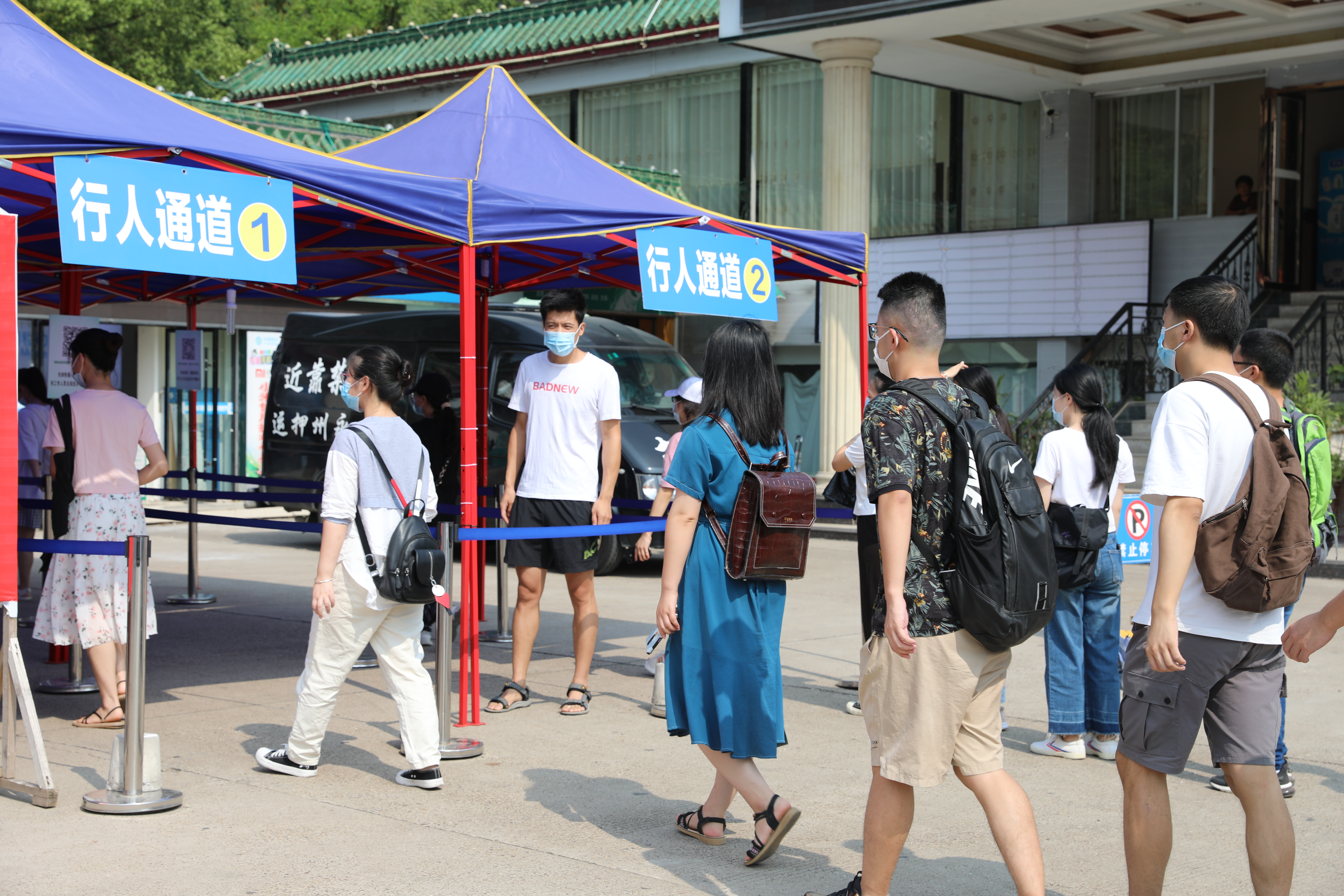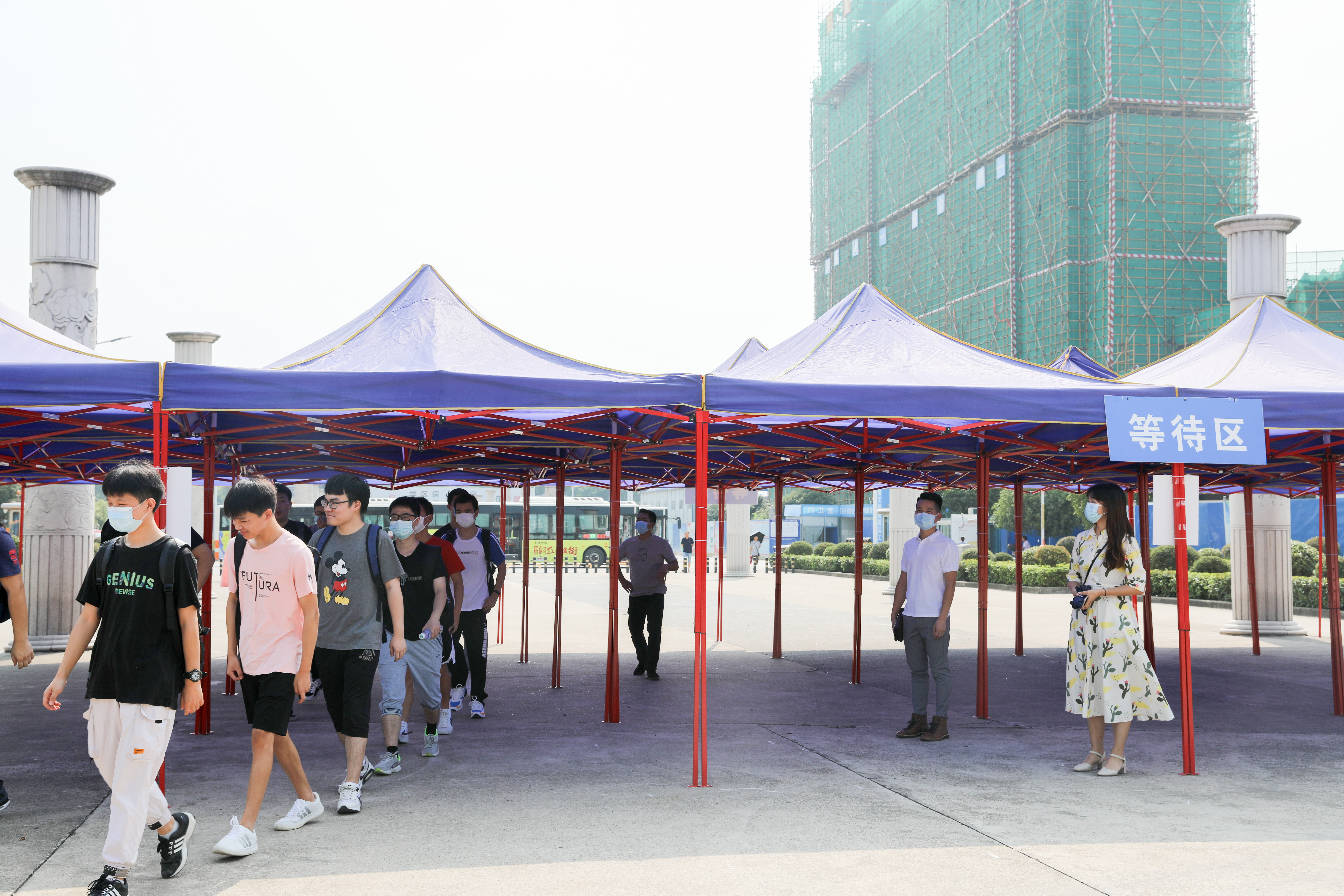 演练中,返校学生佩戴口罩按指示标识排队等候进校,每人间隔1.5米。经值班辅导员引导到“入校通道”,接受健康码核验,显示为绿色且无中高风险地区旅居史的学生,即可至东大门体温监测区进行体温检测,体温正常者可有序进校。如中高风险地区旅居史的学生,还需出示开学前7天内的核酸检测健康报告或相关的健康材料。