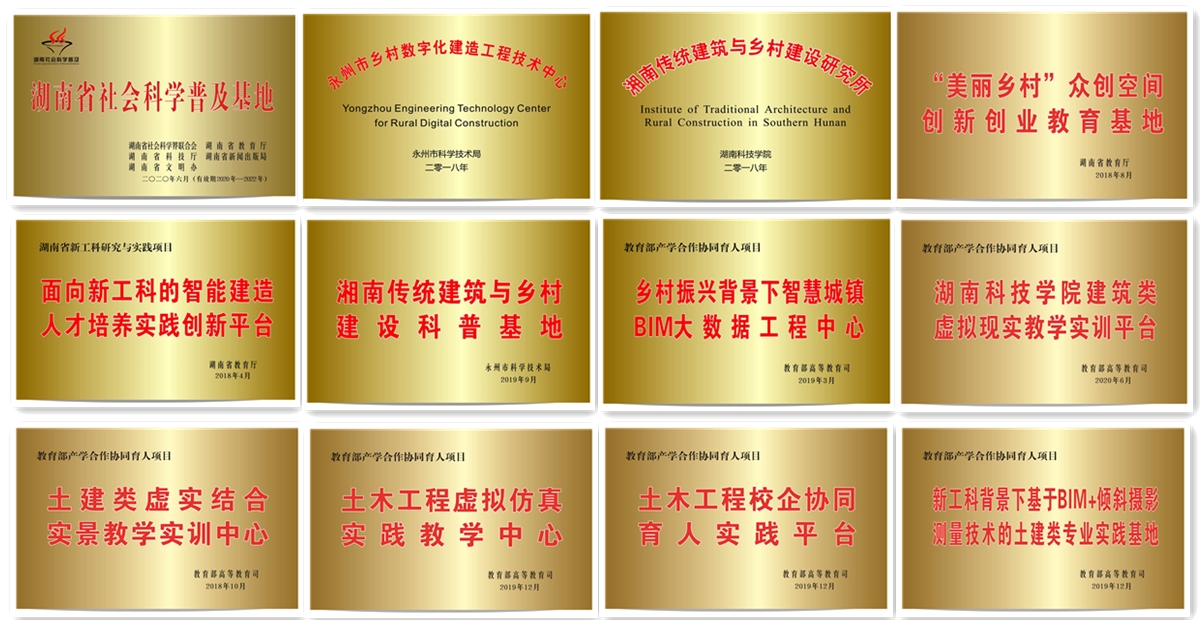 学院现有各类仪器设备价值一千余万元,包括探地雷达测试系统、飞马无人机、大疆无人机、法如三维激光扫描仪、GPS接收机、微机屏显式液压万能试验机等设备。拥有湖南省古建筑文化遗产保护传承社会科学普及基地、湖南省优秀校外实习基地、湖南省校企合作“美丽乡村”众创空间创新创业教育基地等多个省级实践教学基地,拥有BIM技术研发中心、乐鱼官方网站湘南传统建筑与乡村建设研究所、永州市“乡村数字化建造工程技术中心”、永州市“湘南传统建筑科普基地”以及教育部协同育人“乡村振兴背景下智慧城镇BIM大数据工程中心”等实践中心。学院注重与社会多方合作办学、协同育人,与中铁、中交以及湖南建工集团等企业签署了校企合作协议;先后与广州、深圳、长沙、杭州多家知名企业建立校外实习基地、创客中心等人才培养基地。
