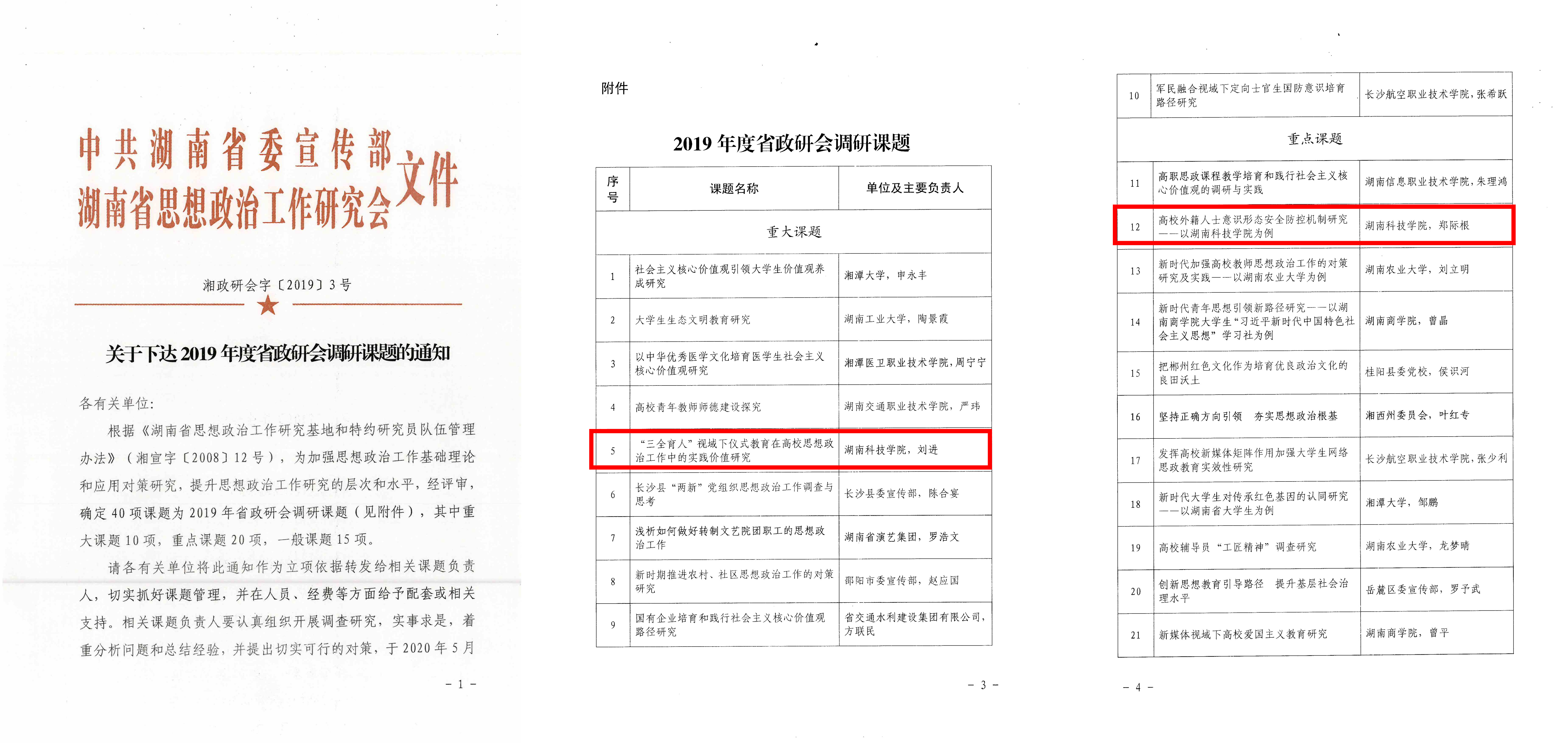 本网讯 12月23日,中共湖南省委宣传部、湖南省思想政治工作研究会发布《关于下达2019年度省政研会调研课题的通知》,我校旅游与文化产业学院教师刘进申报的《“三全育人”视域下仪式教育在高校思想政治工作中的实践价值研究》获重大课题立项,国际交流与合作处处长郑际根申报的《高校外籍人士意识形态安全防控机制研究——以乐鱼官方网站为例》获重点课题立项。