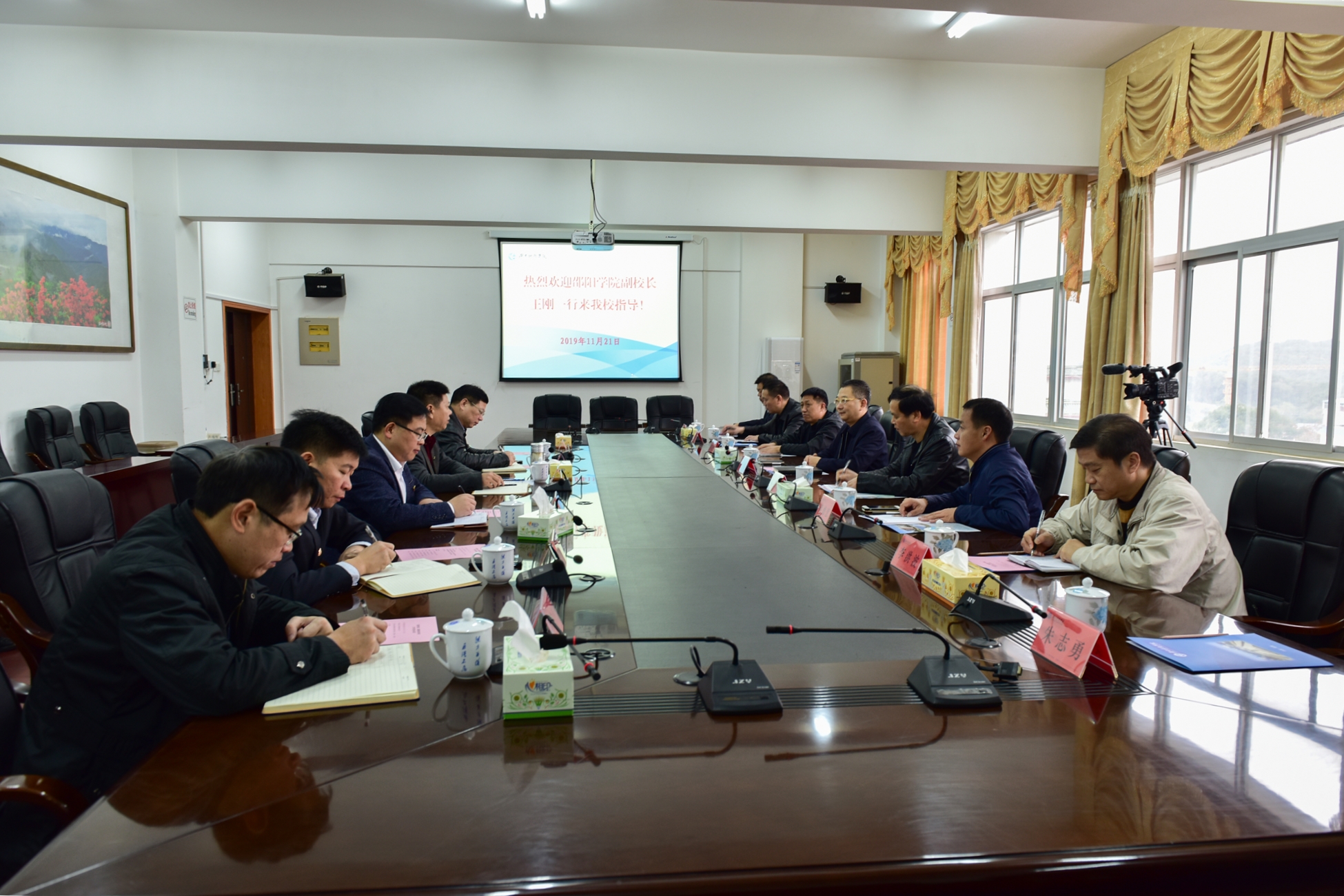 本网讯 11月20日—21日,邵阳学院副校长王刚一行8人来校考察交流,副校长程智开,学工部、基建处、保卫处、后勤服务总公司等职能部门负责人参加交流座谈。座谈会由程智开主持。