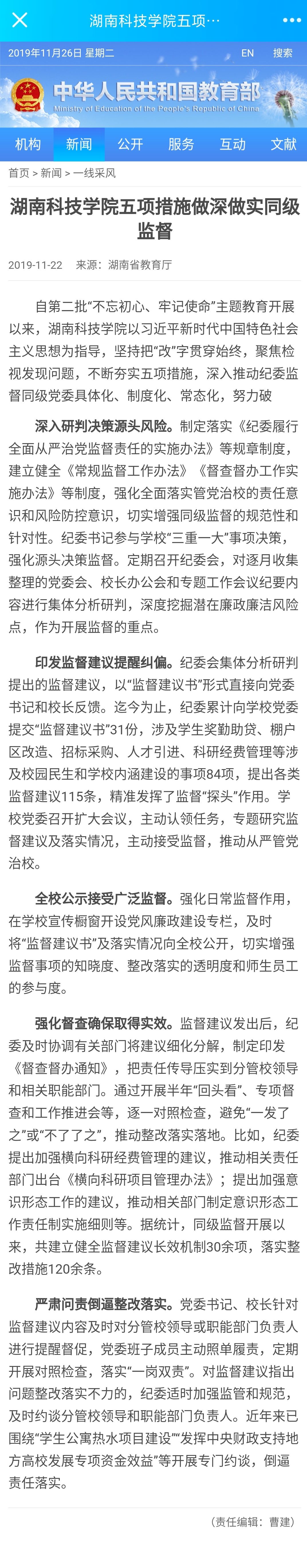 本网讯 11月22日,教育部官网以“乐鱼官方网站五项措施做深做实同级监督”为题,推介我校做深做实同级监督工作经验。
